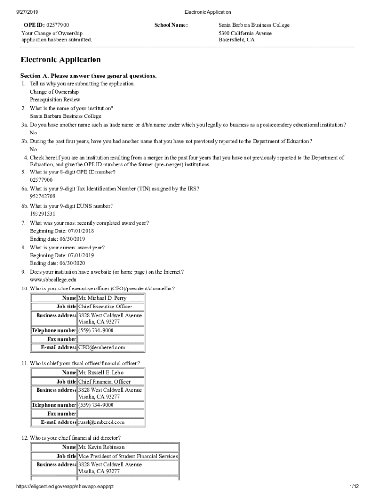 9/27/2019OPE ID: 02577900 Your Change of Ownership application has been submitted.Electronic ApplicationSchool Name:Santa Barbara Business College 5300 California Avenue Bakersfield, CAElectronic