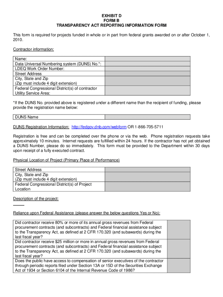 EXHIBIT D FORM B TRANSPARENCY ACT REPORTING INFORMATION FORM This form is required for projects funded in whole or in part from federal grants awarded on or after October 1, 2010. Contractor information: