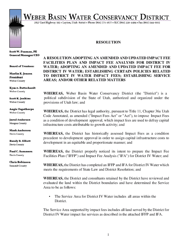 RESOLUTIONA RESOLUTION ADOPTING AN AMENDED AND UPDATED IMPACT FEE FACILITIES PLAN AND IMPACT FEE ANALYSIS FOR DISTRICT IV WATER; ADOPTING AN AMENDED AND UPDATED IMPACT FEE FOR DISTRICT IV WATER; ESTABLISHING