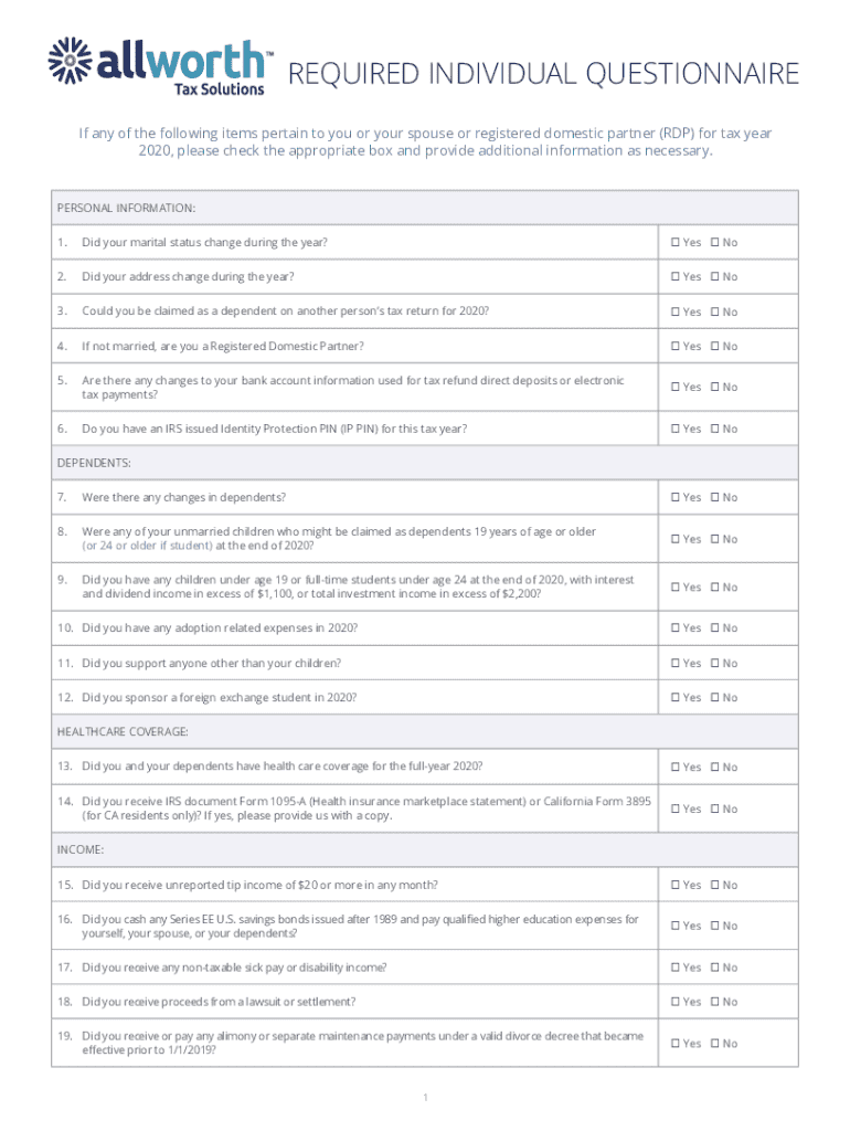 Complete this required questionnaire to provide important tax information for the 2020 tax year, including personal details, income, deductions, and healthcare coverage.