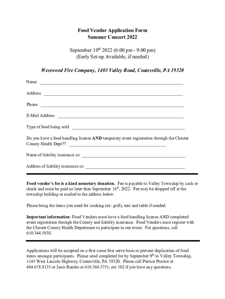 The food vendor application form is a document that needs to be completed by individuals or businesses seeking permission to sell food products in a specific area or venue, ensuring they meet local health and safety regulations.