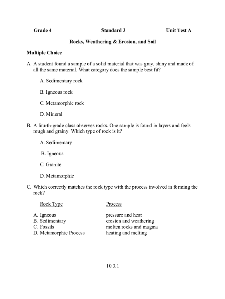 This document includes two unit tests on rocks, weathering, erosion, and soil for 4th graders, featuring multiple-choice questions and constructed response tasks.