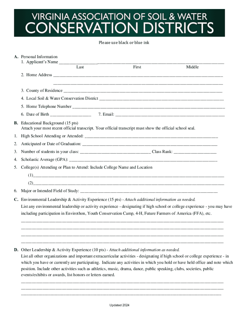 VIRGINIA ASSOCIATION OF SOIL & WATER CONSERVATION DISTRICTS EDUCATIONAL FOUNDATION College Scholarship Application & Guidelines Deadline: March 27, 2024 by 4:30 PM Purpose: To promote the education