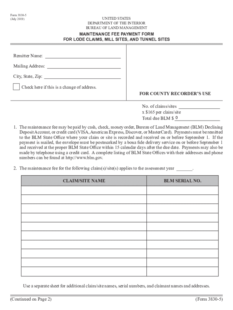 Use this form to submit maintenance fee payments for lode claims, mill sites, and tunnel sites to the Bureau of Land Management (BLM) by September 1.