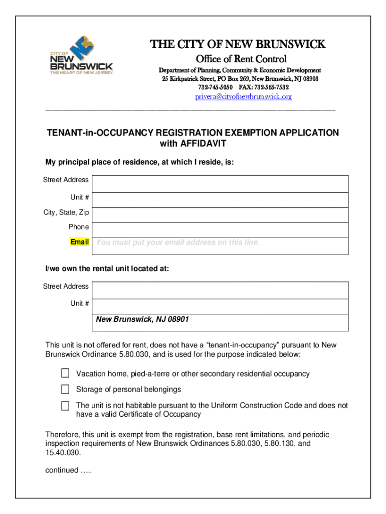 THE CITY OF NEW BRUNSWICK Office of Rent Control Department of Planning, Community & Economic Development 25 Kirkpatrick Street, PO Box 269, New Brunswick, NJ 08903 7327455050 FAX: 7325657532privera@cityofnewbrunswick.org