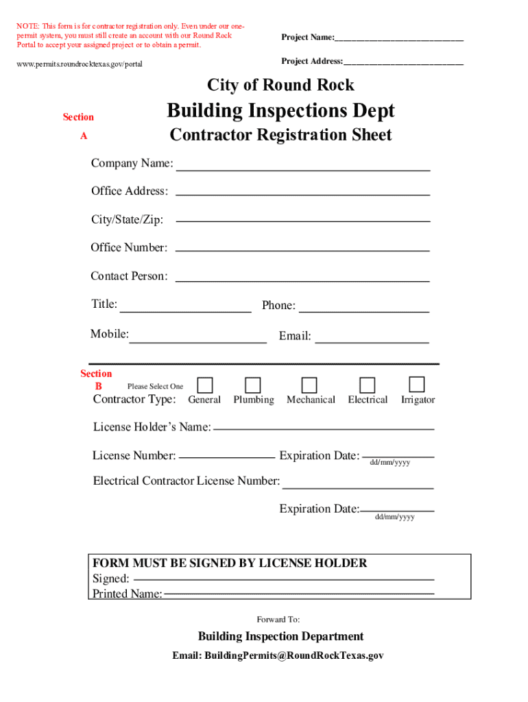 NOTE: This form is for contractor registration only. Even under our one permit system, you must still create an account with our Round Rock