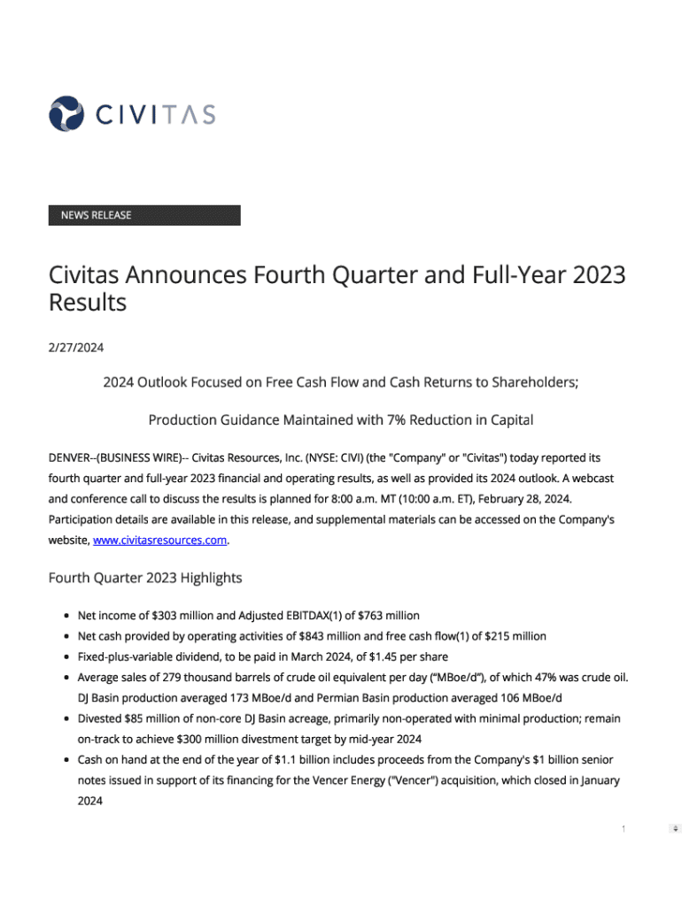 NEWS RELEASECivitas Announces Fourth Quarter and FullYear 2023 Results 2/27/20242024 Outlook Focused on Free Cash Flow and Cash Returns to Shareholders; Production Guidance Maintained with 7% Reduction