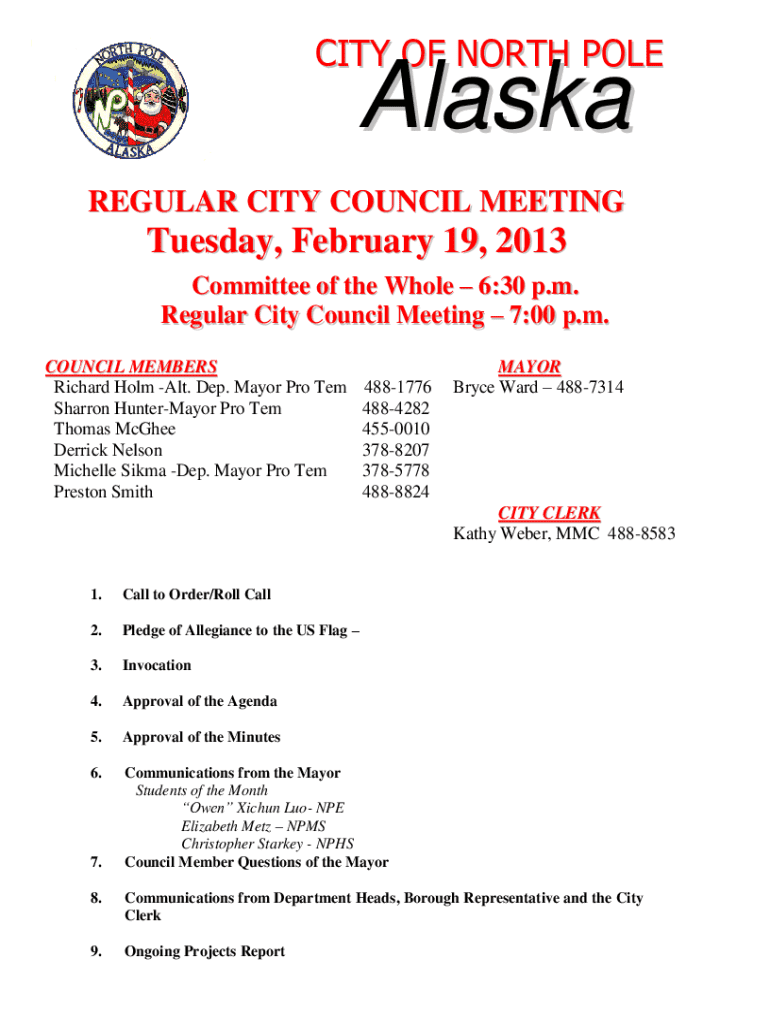 CITY OF NORTH POLEAlaskaREGULAR CITY COUNCIL MEETING Tuesday, February 19, 2013,