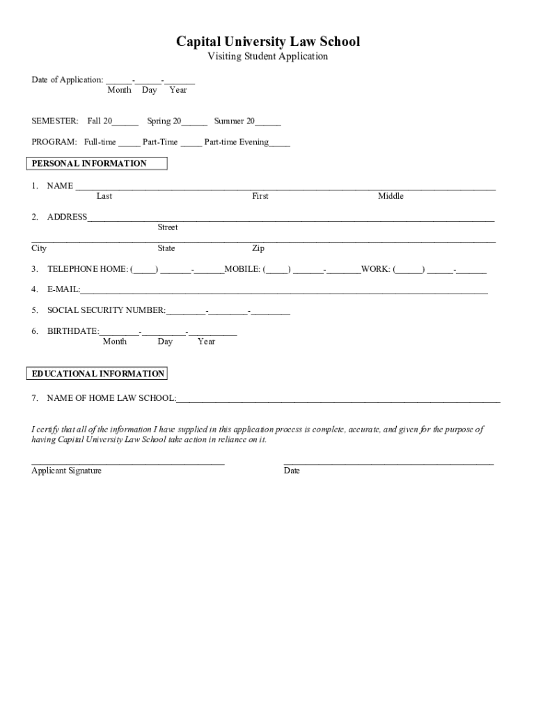 Apply to the Capital University Law School as a visiting student. This application form collects personal and educational information for the academic year 2023.