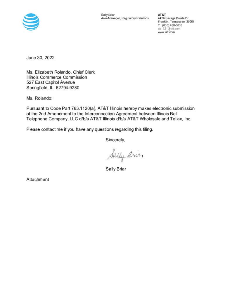Sally Brian Area Manager, Regulatory Relations AT&T 4426 Savage Point Dr. Franklin, Tennessee 37064 T: (630) 4605833 sb1621@att.com www.att.comJune 30, 2022 Ms. Elizabeth Rolando, Chief Clerk Illinois