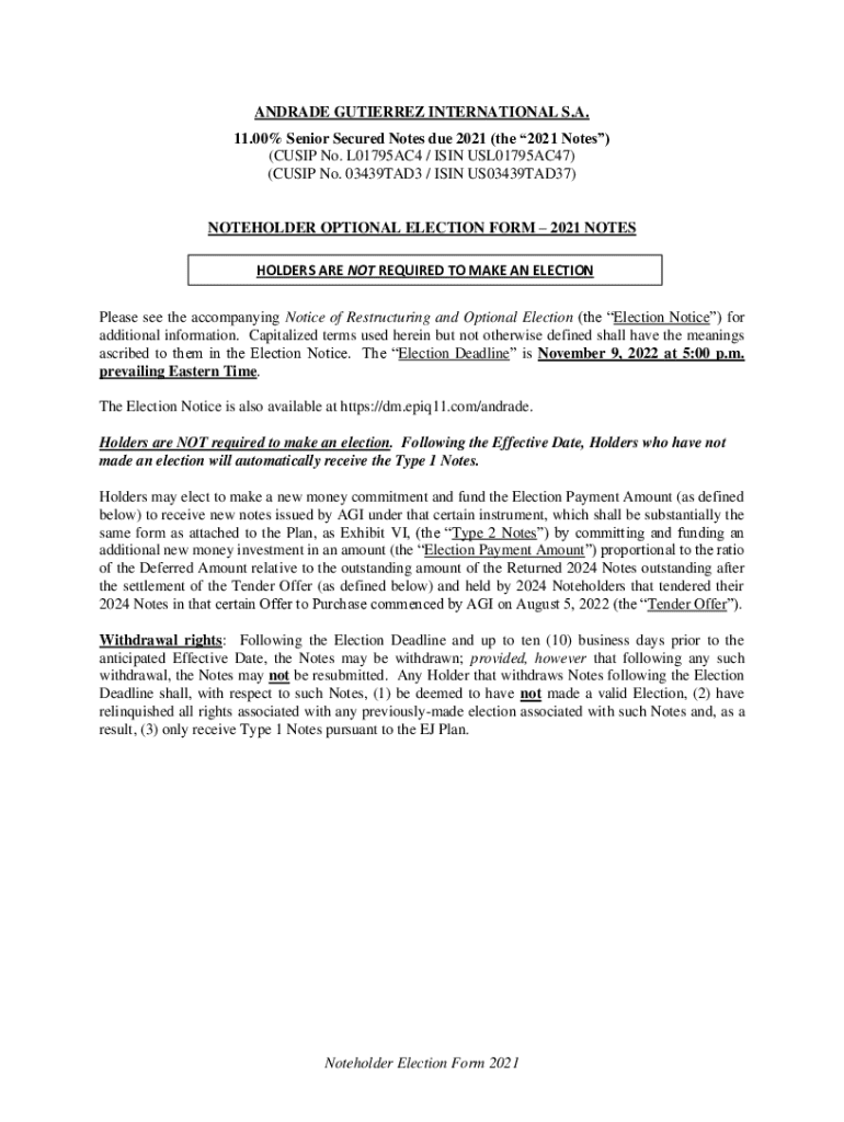 ANDRADE GUTIERREZ INTERNATIONAL S.A. 11.00% Senior Secured Notes due 2021 (the 2021 Notes) (CUSIP No. L01795AC4 / ISIN USL01795AC47) (CUSIP No. 03439TAD3 / ISIN US03439TAD37) NOTEHOLDER OPTIONAL ELECTION