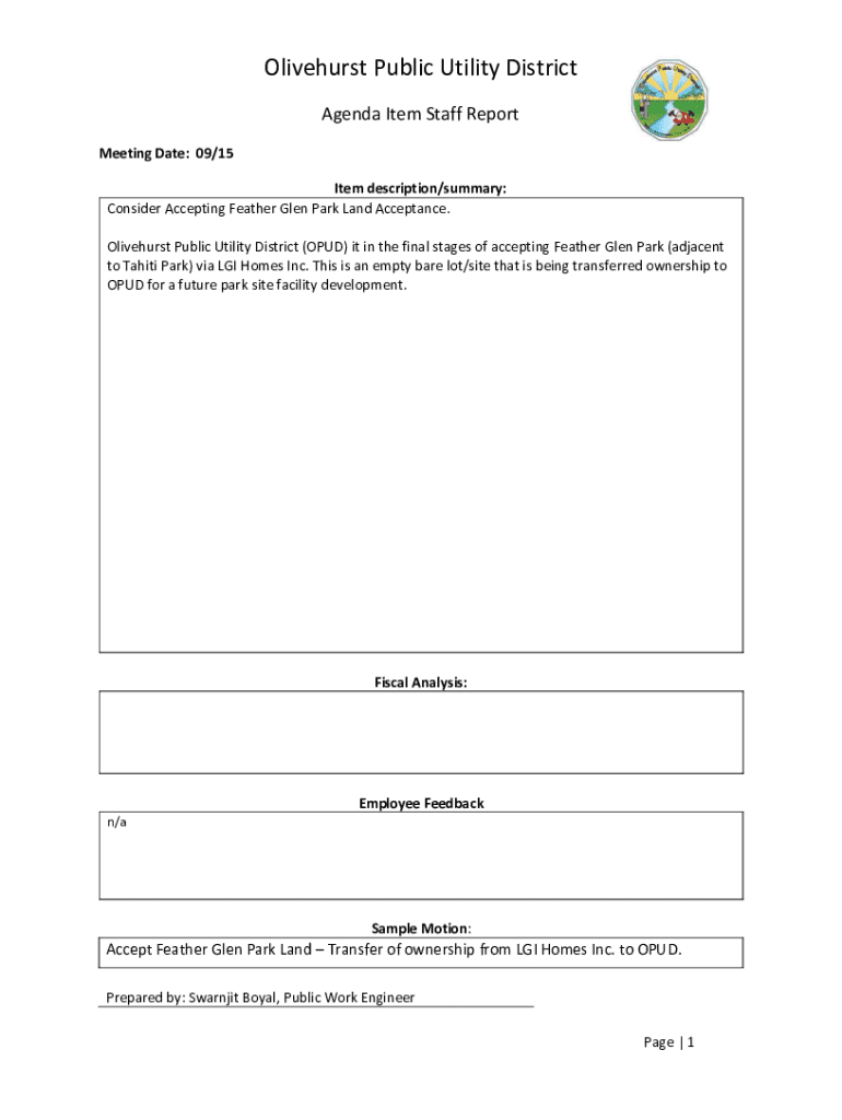 Get the free Olivehurst Public Utility District Agenda Item Staff Report