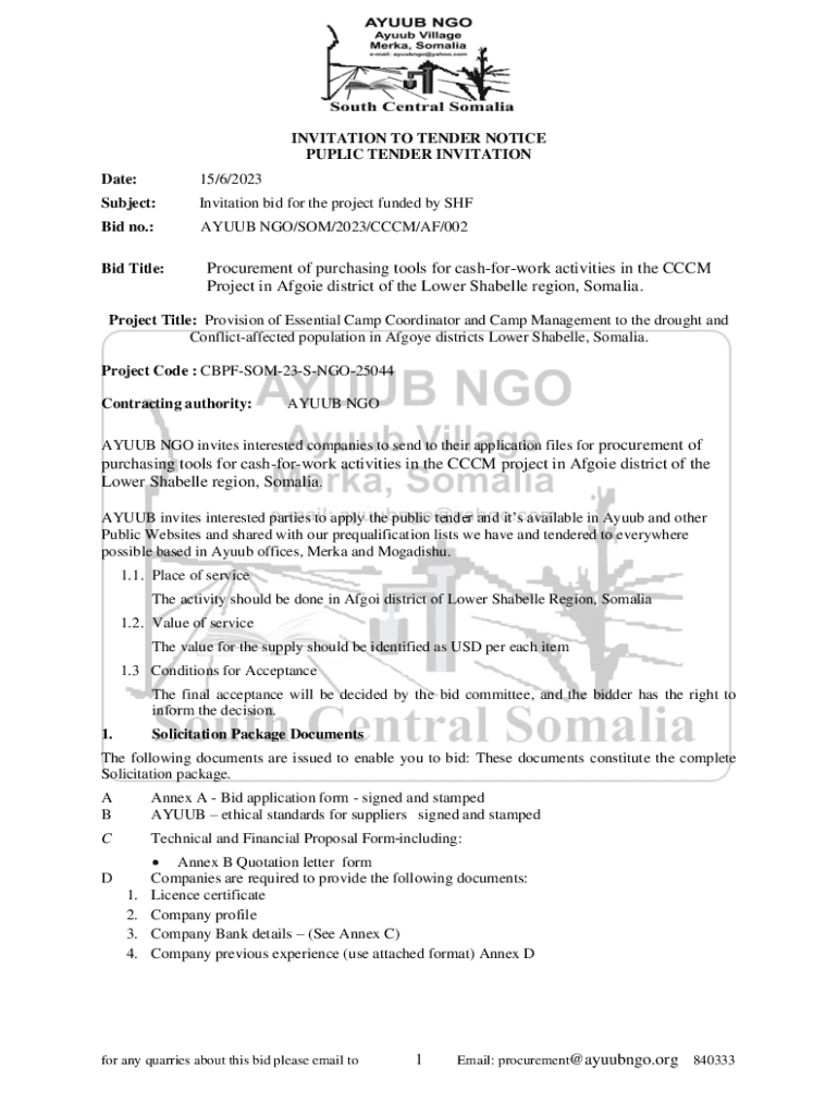 Date:15/6/2023Subject:Invitation bid for the project funded by Shahid no.:AFUB NGO/SOME/2023/CCC/AF/002Bid Title:Procurement of purchasing tools
