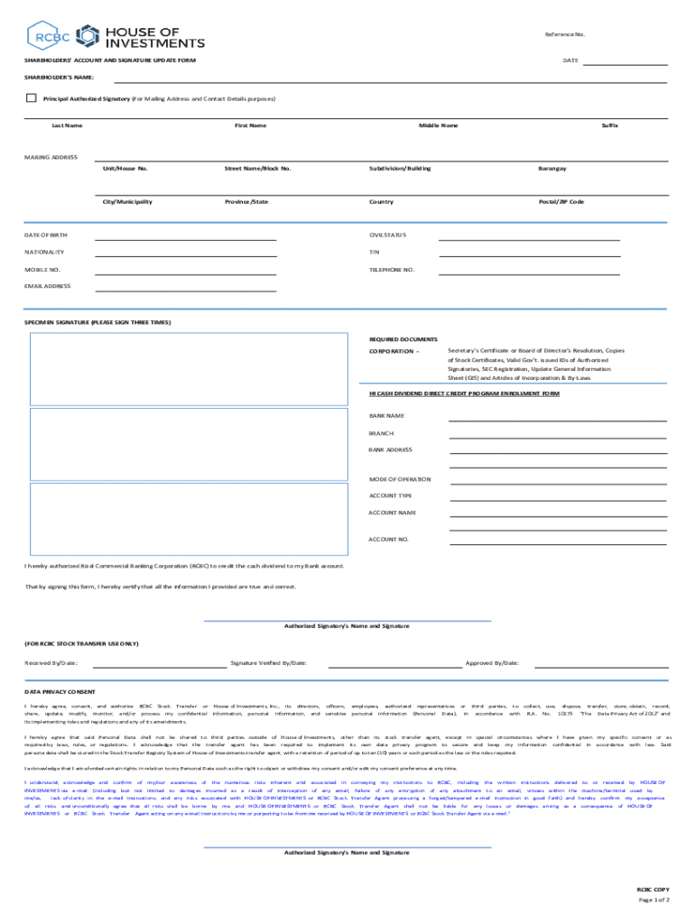 Reference No. SHAREHOLDERS ACCOUNT AND SIGNATURE UPDATE FORMDATESHAREHOLDER\'S NAME:Principal Authorized Signatory (For Mailing Address and Contact Details purposes)Last NameFirst NameMiddle NameSuffixMAILING