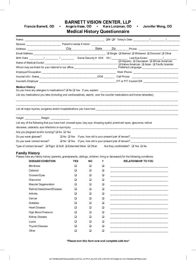 Francis Barnett, ODBARNETT VISION CENTER, LLP Angela Hase, ODKara Lunzman, ODMedical History QuestionnaireJennifer Wong, ODName:___ M F Todays Date:___ /___ /___ Spouse:___ Parents names if minor: