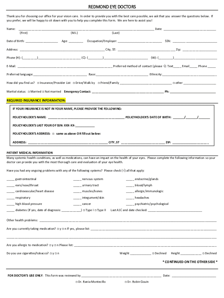 Redmond Eye Doctors Patient is not the form you're looking for?Search for another form here.