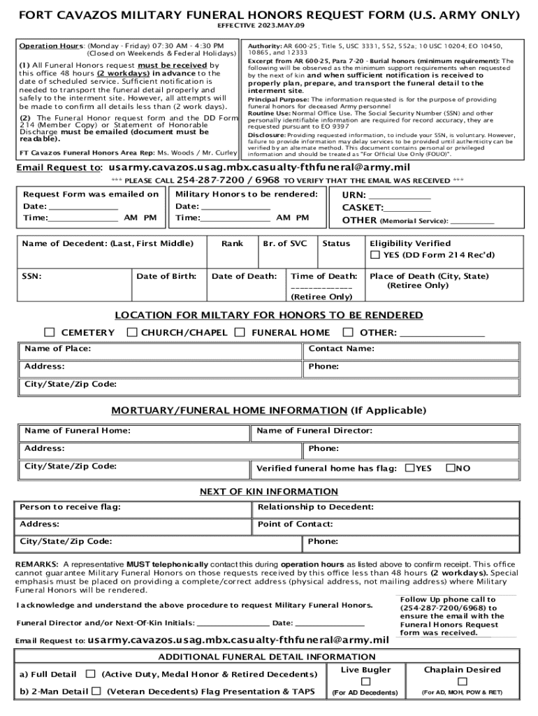 FORT CAVAZOS MILITARY FUNERAL HONORS REQUEST FORM (U.S. ARMY ONLY) EFFECTIVE 2023.MAY.09Operation Hours: (Monday Friday) 07:30 AM 4:30 PM (Closed on Weekends & Federal Holidays)(1) All Funeral Honors