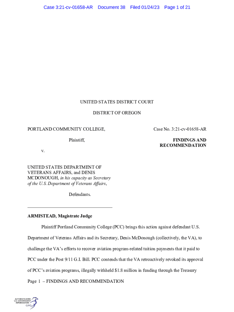 This document covers the findings and recommendations regarding Portland Community College\'s dispute with the U.S. Department of Veterans Affairs over alleged tuition overpayments and the due process of law in 2023.