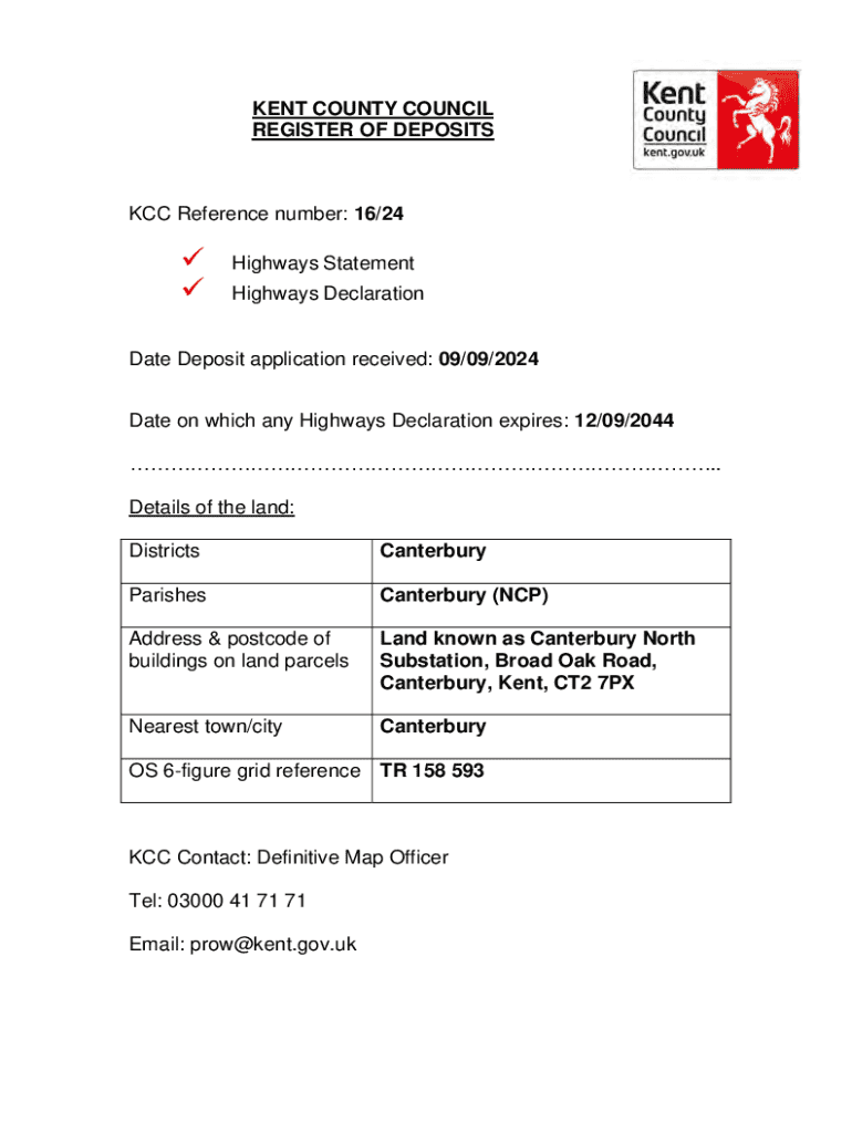 KENT COUNTY COUNCIL REGISTER OF DEPOSITSKCC Reference number: 16/24 Highways Statement Highways DeclarationDate Deposit application received: 09/09/2024 Date on which any Highways Declaration expires: