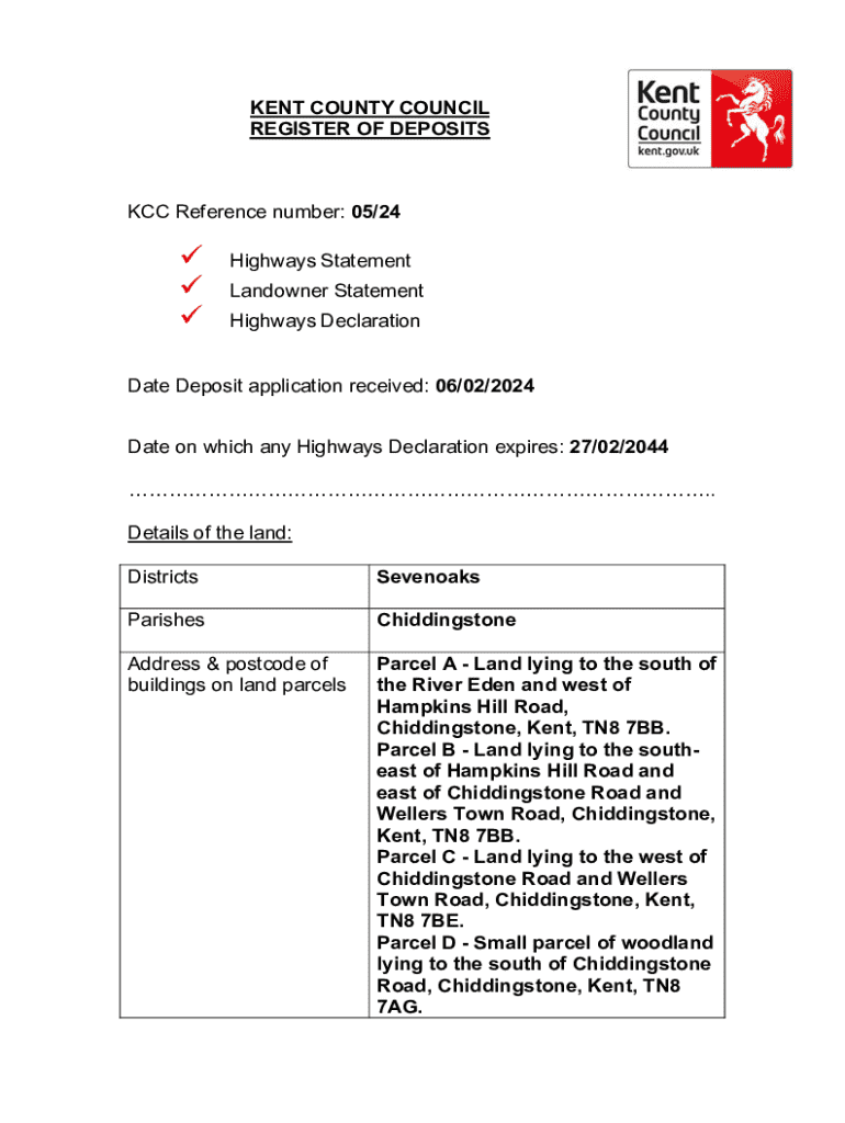 KENT COUNTY COUNCIL REGISTER OF DEPOSITS Reference number: 05/24 Highways Statement Landowner Statement Highways DeclarationDate Deposit application received: 06/02/2024 Date on which any Highways