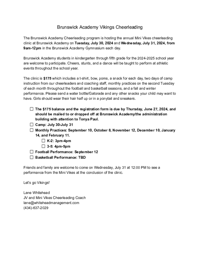 Brunswick Academy Vikings Cheerleading The Brunswick Academy Cheerleading program is hosting the annual Mini Likes cheerleading clinic at Brunswick Academy on Tuesday, July 30, 2024, and Wednesday,