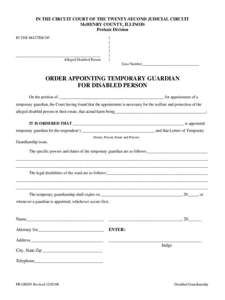 This document outlines the order appointing a temporary guardian for an alleged disabled person in McHenry County, ensuring their welfare and protection, as required by court.
