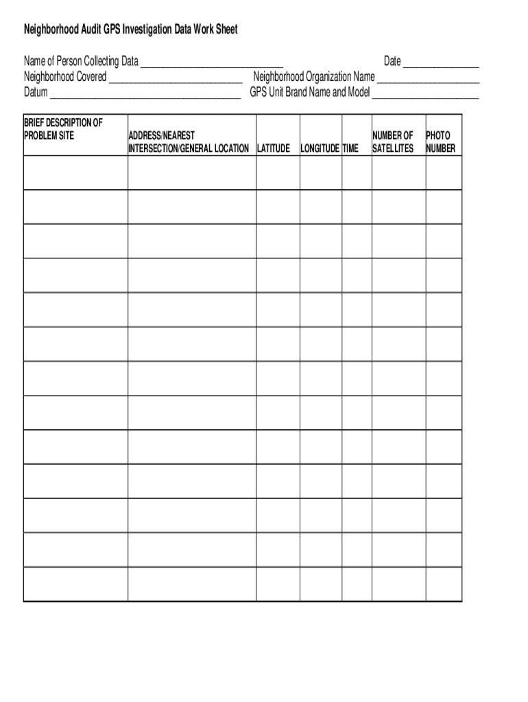 Get the free NEIGHBORHOOD AUDIT GPS INVESTIGATION DATA WORK SHEET. Region ID