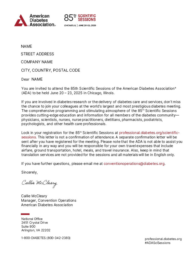 TODAY\'S DATE BACKSTREET ADDRESS COMPANY AMENITY, COUNTRY, POSTAL CODE Dear NAME You are invited to attend the 85th Scientific Sessions of the American Diabetes Association (ADA) to be held June 20