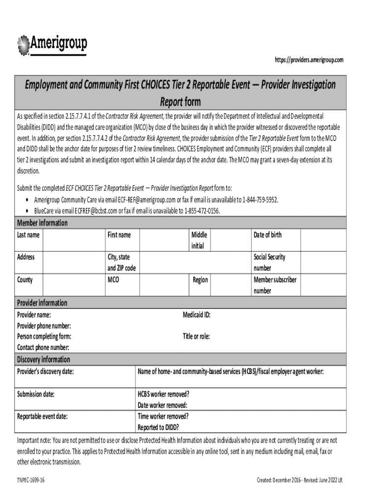 Https://providers.Amerigroup.employment and Community First CHOICES Tier 2 Reportable Event Provider Investigation Report form As specified in section 2.15.7.7.4.1 of the Contractor Risk Agreement,