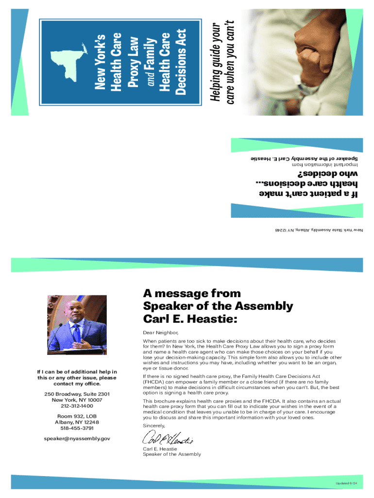 Helping guide your care when you cantNew Yorks Health Care Proxy Law and Family Health Care Decisions ActImportant information from Speaker of the Assembly Carl E. HeastieIf a patient cant make health