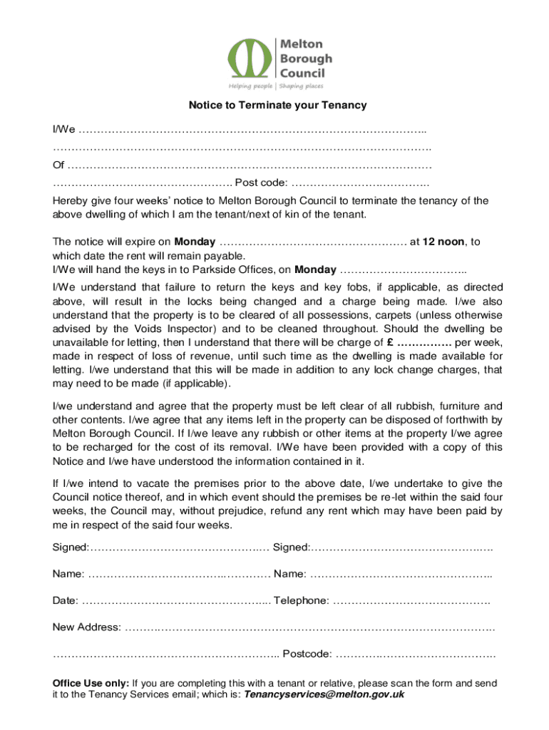 This document outlines the procedure for terminating your tenancy with Melton Borough Council, including notice requirements and property obligations.