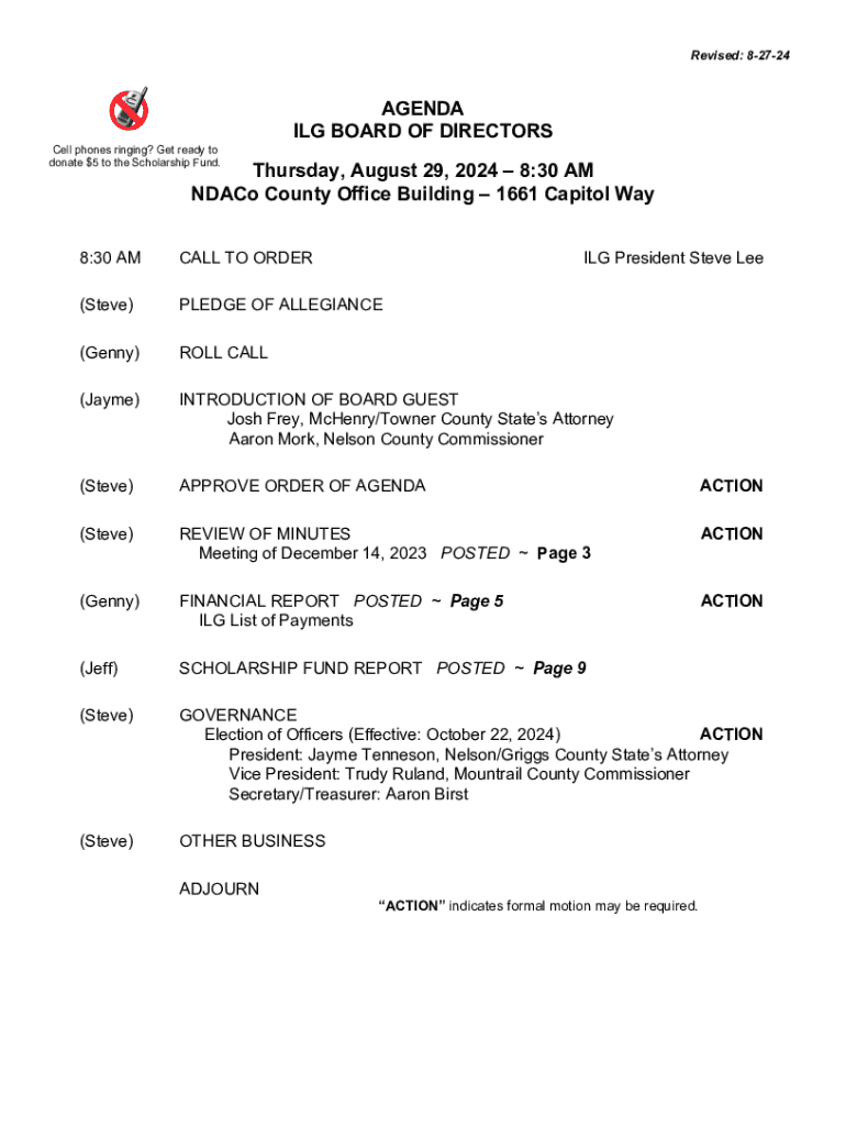 Revised: 82724Cell phones ringing? Get ready to donate $5 to the Scholarship Fund. AGENDA ILG BOARD OF DIRECTORS Thursday, August 29, 2024 8:30 AM NATO County Office Building 1661 Capitol Way8:30