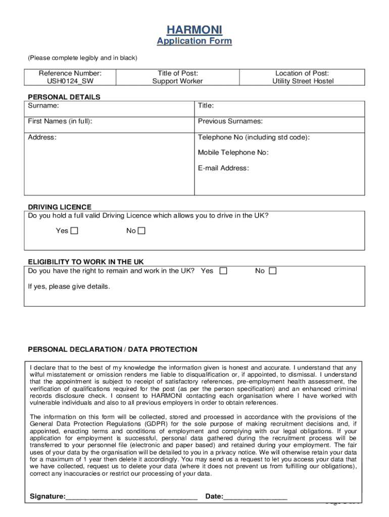 HARMONI Application Form (Please complete legibly and in black)Reference Number: USH0124_SWTitle of Post: Support WorkerLocation of Post: Utility Street HostelPERSONAL DETAILS Surname:Title:First