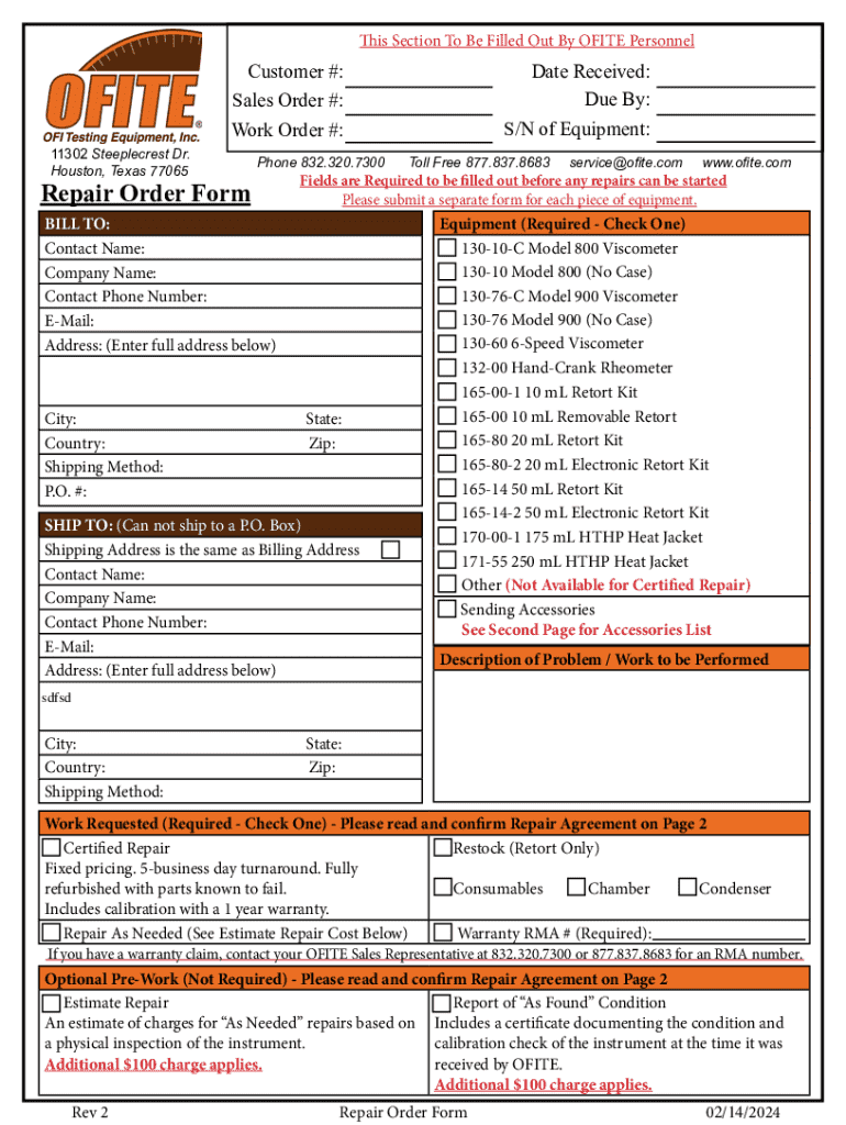 This Section To Be Filled Out By OF ITE PersonnelDate Received: Due By:Customer #: Sales Order #: Work Order #: 11302 Steeple crest Dr. Houston, Texas 77065Phone 832.320.7300Repair Order Foretold