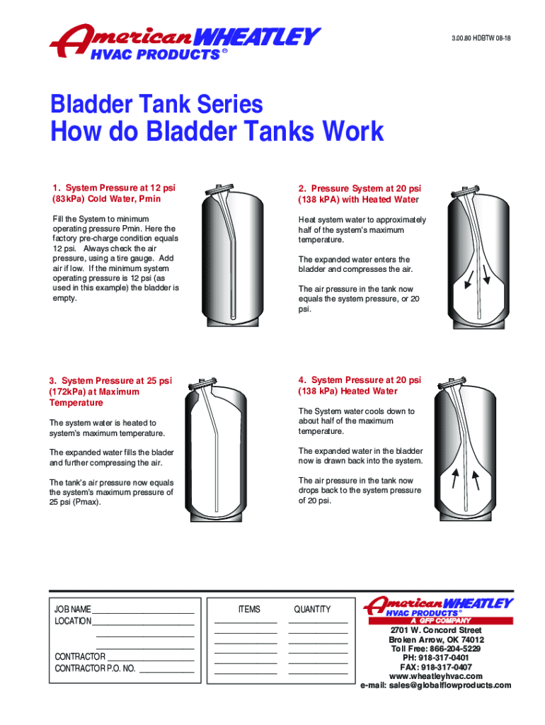 3.00.80 HDBTW 0818 RBladder Tank SeriesHow do Bladder Tanks Work 1. System Pressure at 12 psi (83kPa) Cold Water, Pmin2. Pressure System at 20 psi (138 kPA) with Heated WaterFill the System to minimum
