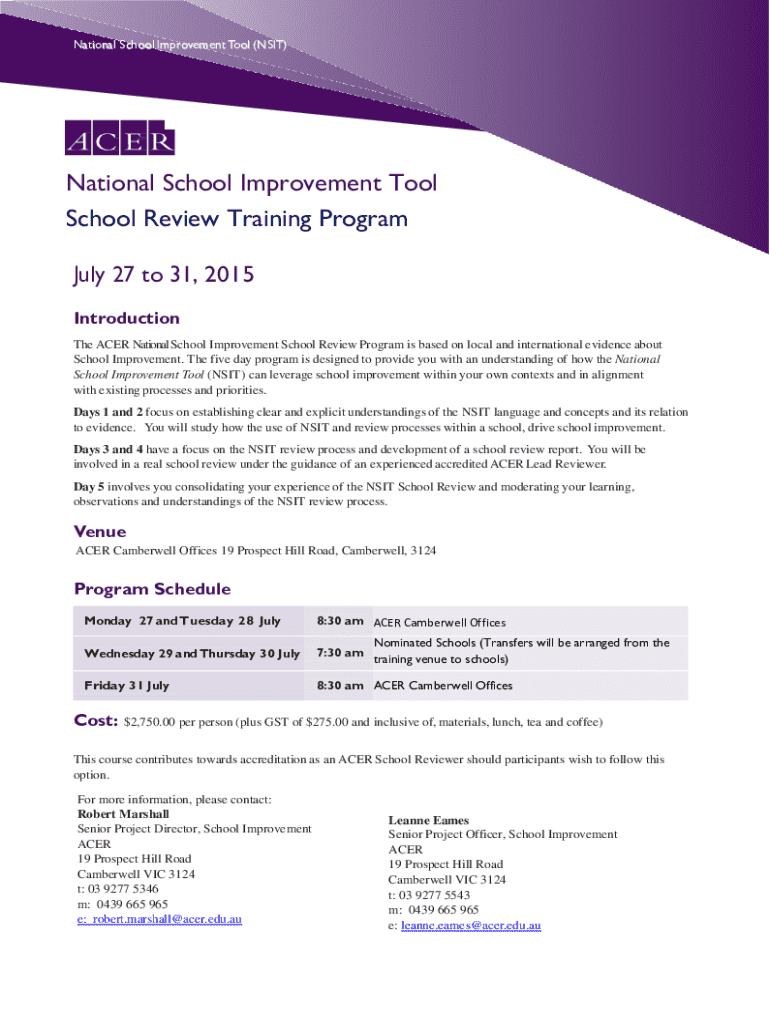 Nation Neil Such oil I'm approved men NT Too of (N NS IIT)National School Improvement Tool School Review Training Program July 27 to 31, 2015 Introduction The ACER National School Improvement School