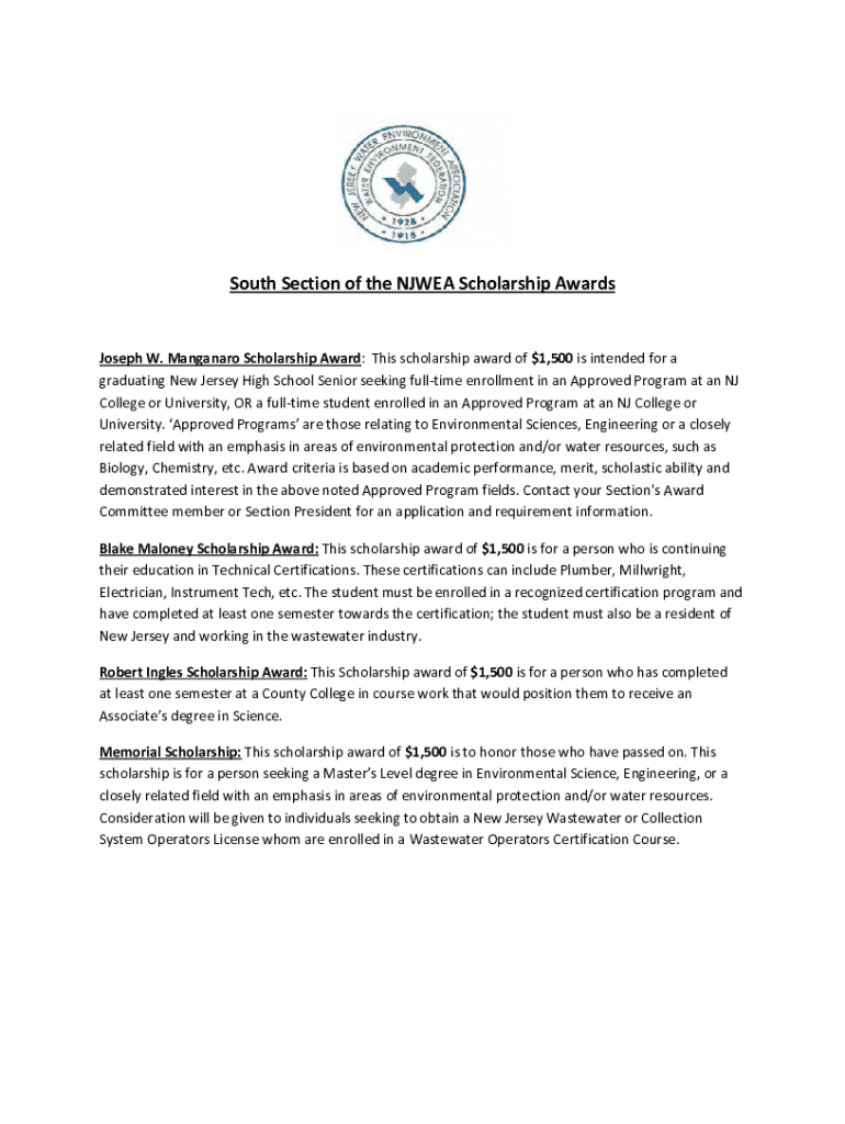 South Section of the NWEA Scholarship Awards Joseph W. Manganese Scholarship Award: This scholarship award of $1,500 is intended for a graduating from New Jersey High School Senior seeking full time