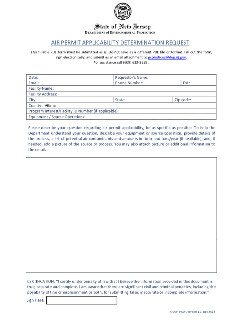 DEPARTMENT of ENVIRONMENTAL PROTECTIONAIR PERMIT APPLICABILITY DETERMINATION REQUEST This fillable PDF form must be submitted as is. Do not save as a different PDF file or format. Fill out the form,