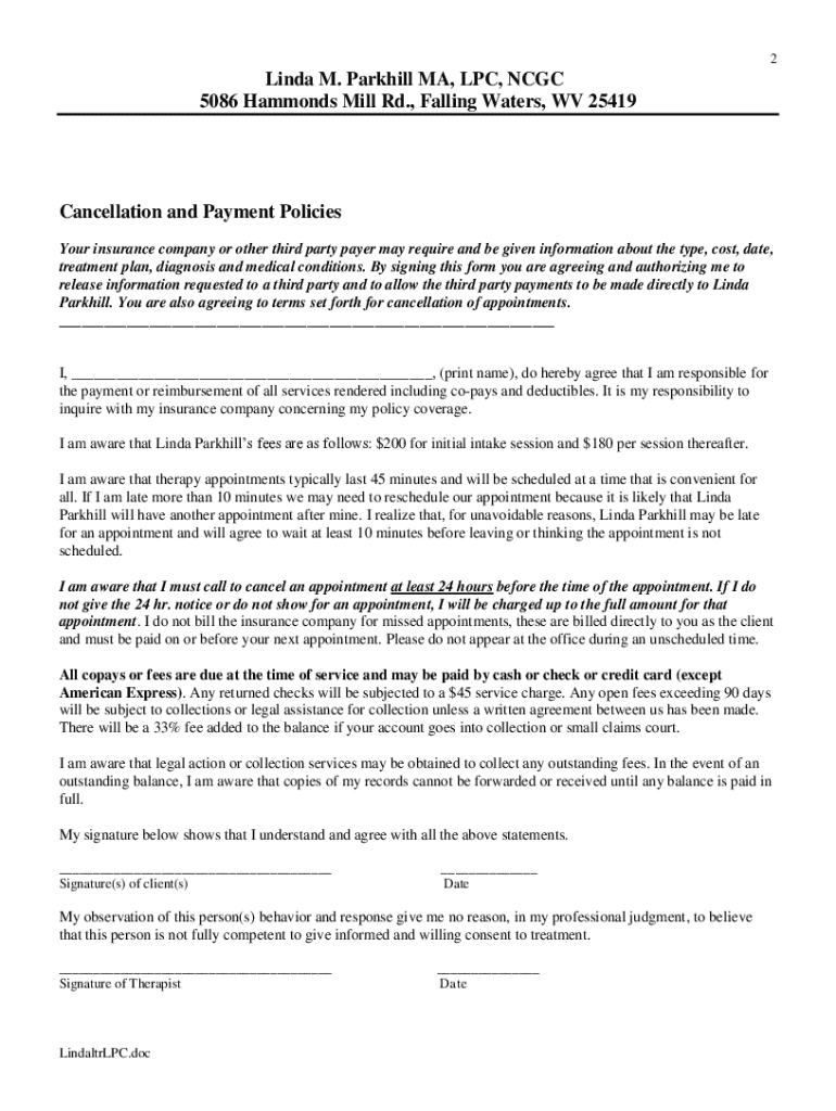 2Linda M. Park hill MA, LPC, NGC 5086 Hammond's Mill Rd., Falling Waters, WV 25419Cancellation and Payment Policies Your insurance company or other third party payer may require and be given information