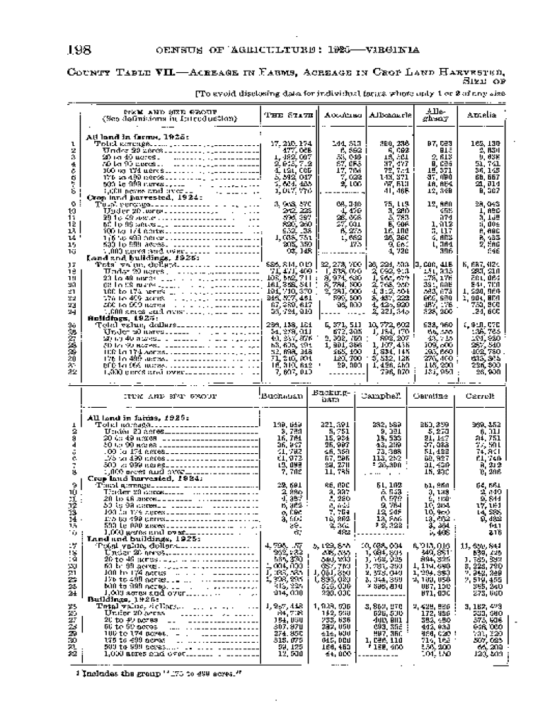 198CENSUS OF \'AGRICULTURE: 125VIRGINIACouNTY TABLE VII.AcREAGE IN FARMS, AcREAGE IN C:aoP LAND HARVESTED,Snm oF[To avoid disclosing data for individual farms where only 1 or 2 of any size ITEM AND