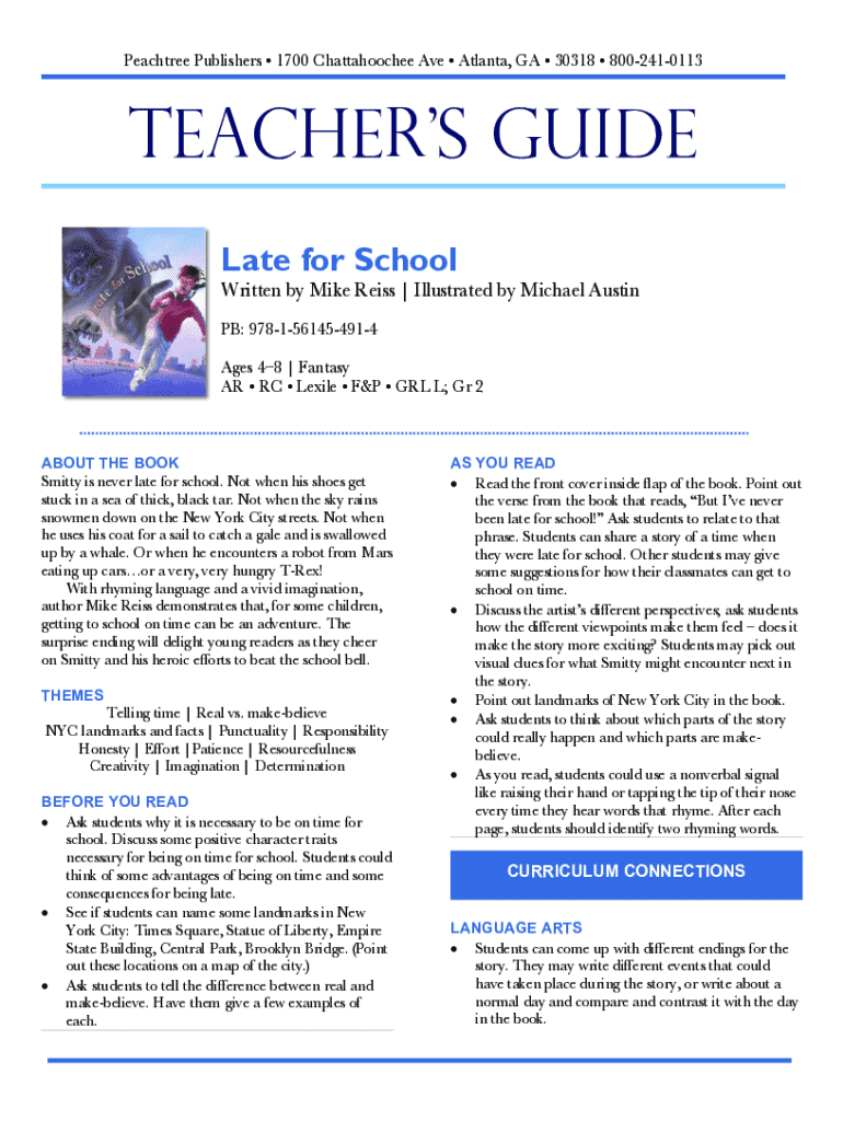 Peachtree Publishers 1700 Chattahoochee Ave Atlanta, GA 30318 8002410113TEACHERS GUIDE Late for School Written by Mike Reiss | Illustrated by Michael Austin PB: 9781561454914 Ages 48 | Fantasy AR