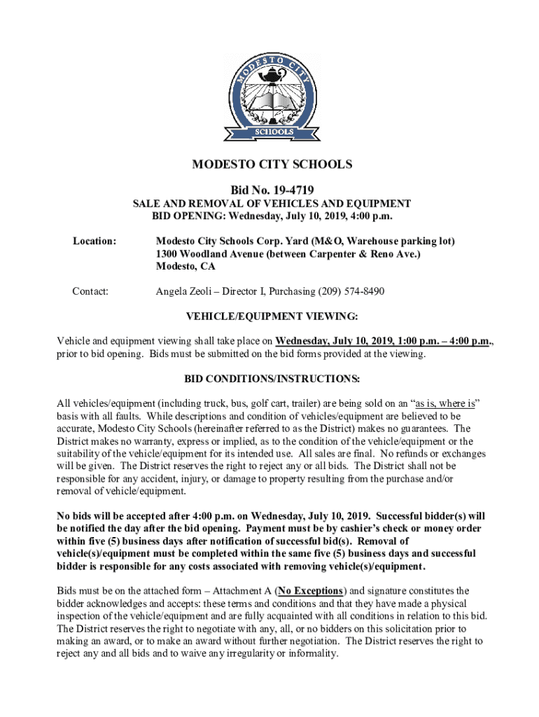 MODESTO CITY SCHOOLS Bid No. 194719SALE AND REMOVAL OF VEHICLES AND EQUIPMENT BID OPENING: Wednesday, July 10, 2019, 4:00 p.m. Location:Modesto City Schools Corp. Yard (M&O, Warehouse parking lot)