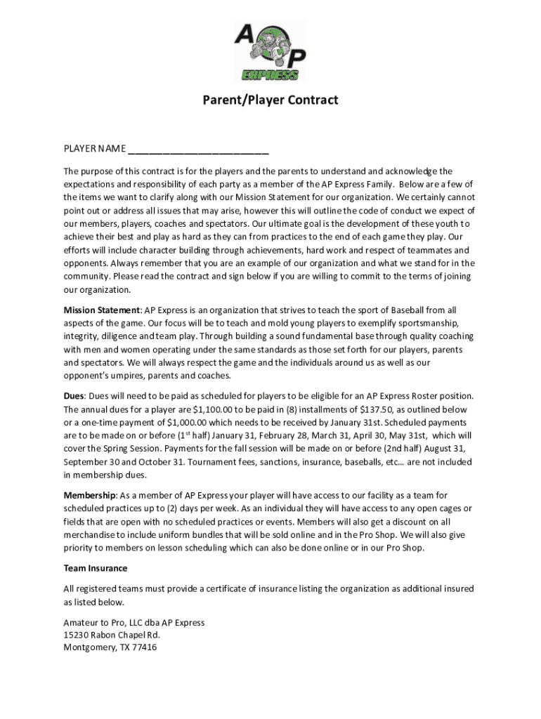 Parent/Player Contract PLAYER NAME ___ The purpose of this contract is for the players and the parents to understand and acknowledge the expectations and responsibility of each party as a member of
