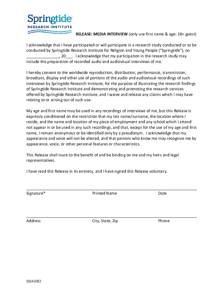 This release form secures consent for audio and audiovisual interviews for research by Springtide Research Institute focusing on religion and young people.