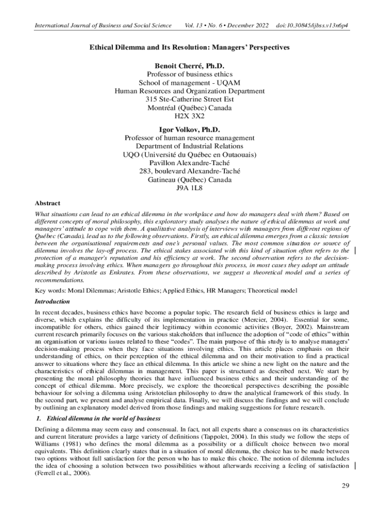 International Journal of Business and Social Science. 13 No. 6 December 2022doi:10.30845/ijbss.v13n6p4Ethical Dilemma and Its Resolution: Managers Perspectives