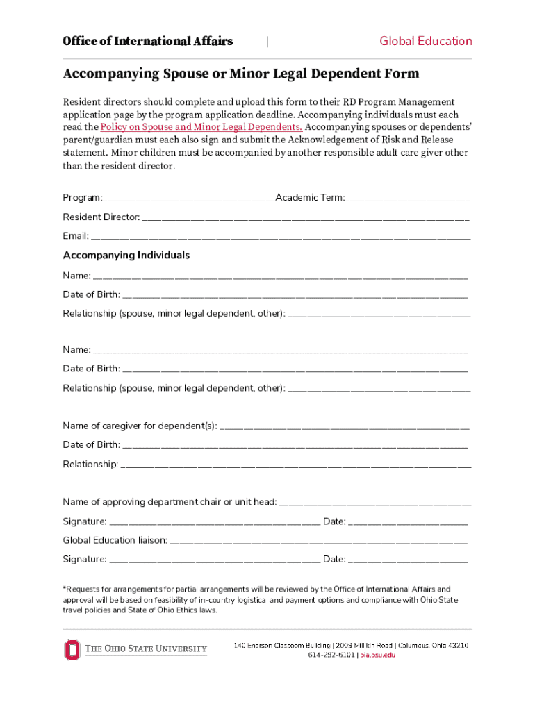 Complete the Accompanying Spouse or Minor Legal Dependent Form for Global Education programs. Ensure all signatures are obtained for approval.