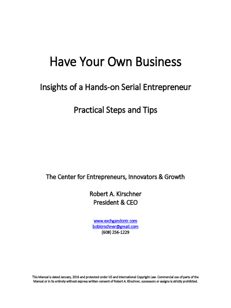 Have Your Own Business Insights of a Hanson Serial Entrepreneur Practical Steps and Tithe Center for Entrepreneurs, Innovators & Growth Robert A. Kirchner President & CEO www.exchgandcntr.com bobkirschner@gmail.com