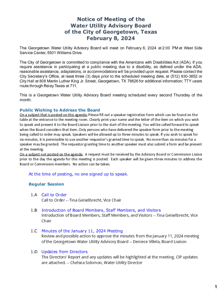 Notice of Meeting of the Water Utility Advisory Board of the City of Georgetown, Texas February 8, 2024, The Georgetown Water Utility Advisory Board will meet on February 8, 2024, at 2:00 PM at West