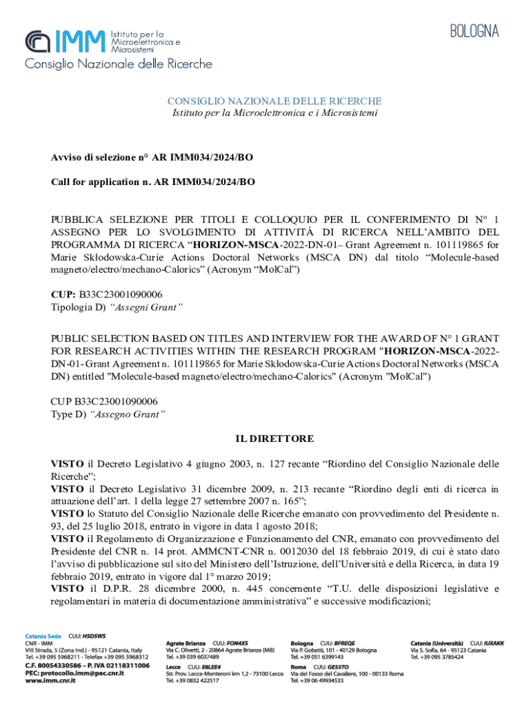 CONSIGNED NATIONAL DELL RECHERCHE Institute per la Microelectronics e i MicrosistemiAvviso DI selection n AR IMM034/2024/BO Call for application n. AR IMM034/2024/BO PUBLIC SELECTION PER TITLE E COLLOQ