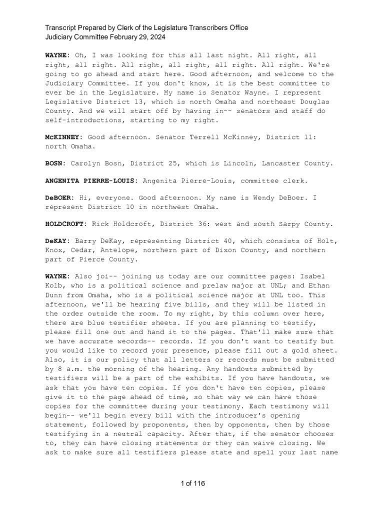 Transcript Prepared by Clerk of the Legislature Transcribers Office Judiciary Committee February 29, 2024 WAYNE: Oh, I was looking for this all last night. All right, all right, all right. All right,